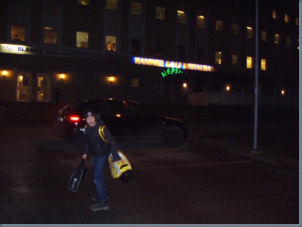Varje måndag har Pontus inomhusträning på golfen och Björn brukar vara bussig och skjutsa i vanliga fall. Björn har varit krasslig ett tag och har nu bestämt sig för att vara lite snäll mot sin kropp och stanna hemma. Tok-Åsa körde därför Pontus till golfen i Jordbro igår.