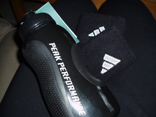Jag fick två svarta svettband för handlederna och en snygg vattenflaska som jag ska ha när vi spelar badminton. Jättebra presenter, eller hur?