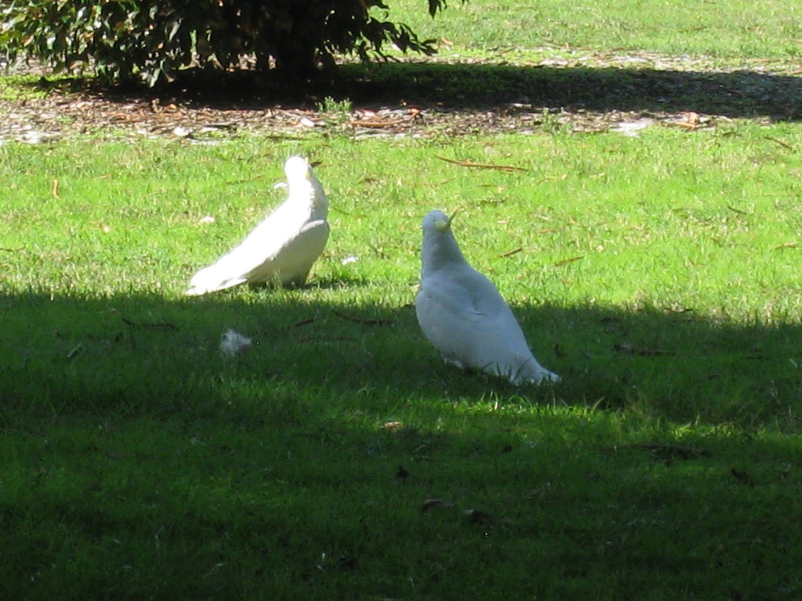 Det är gott om fåglar i parken och här sitter kakaduorna och letar godsaker i gräsmattan.