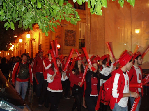 Herregud, vilket party det är i stan! På minussidan ligger dock det här med smällarna. Små elaka högljudda saker som ekar mellan väggarna i de smala gränderna och får oss oskuldsfulla nordbor att hoppa högt. (Vi vaknade båda med tinnitus i morse.) Alla har med sig sin egen bar i en plastpåse. Sprit, groggvirke och is. Överallt sitter alla och blandar sina egna drinkar men ingen fylla så långt man ser.